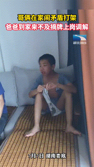 哥俩在家闹矛盾打架,爸爸到家来不及摘牌上岗调解。